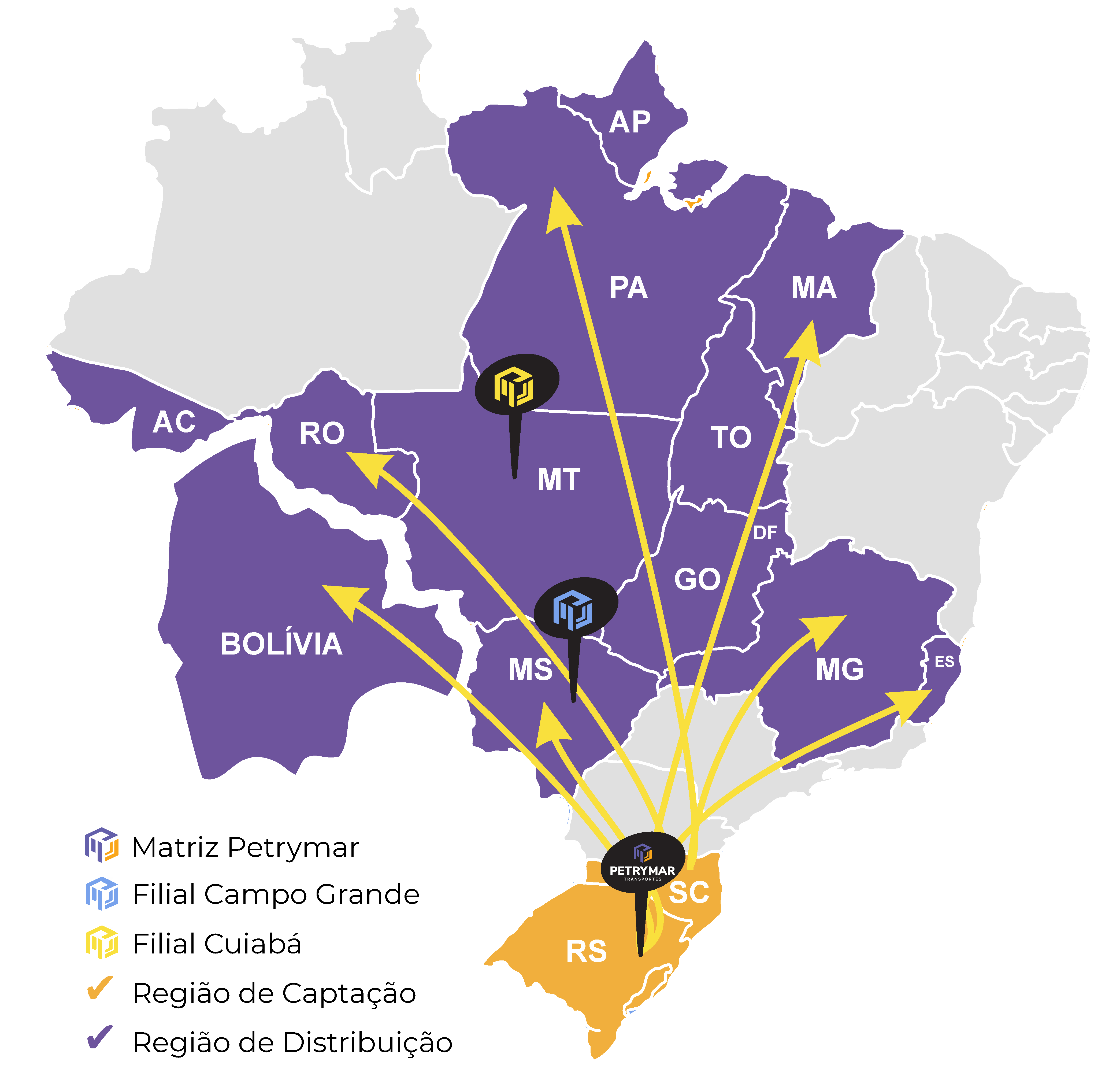Atendemos os estados de MS, MT, GO, DF, MG, ES, RO, AC, AP, TO, PA e MA para cargas fracionadas e cargas completas para todo o Brasil. Para garantir agilidade e suporte em rotas estratégicas, contamos com filiais em Campo Grande (MS) e em Cuiabá (MT).